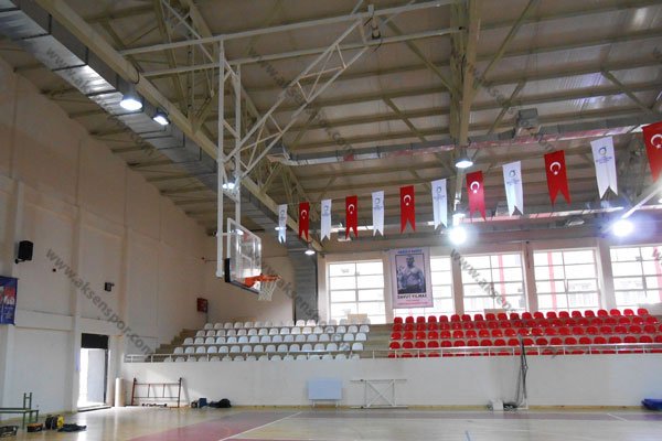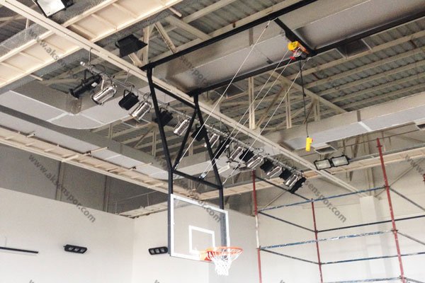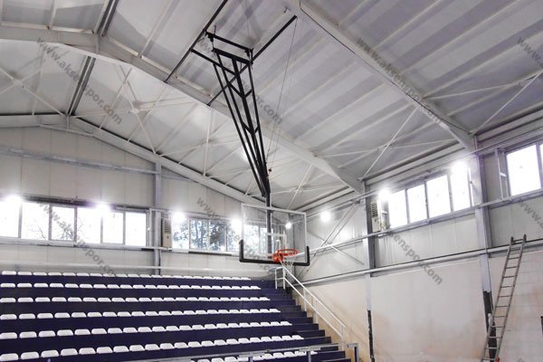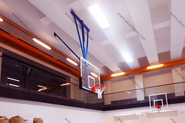 105×180 cm 15mm akrilik cam panyalı, hidrolik esnek çemberli, panya altı poliüretan koruma pedli, elektirik motorlu pano kumanda sistemli , sabit sistemli TAVANDAN ASMA BASKETBOL POTASI